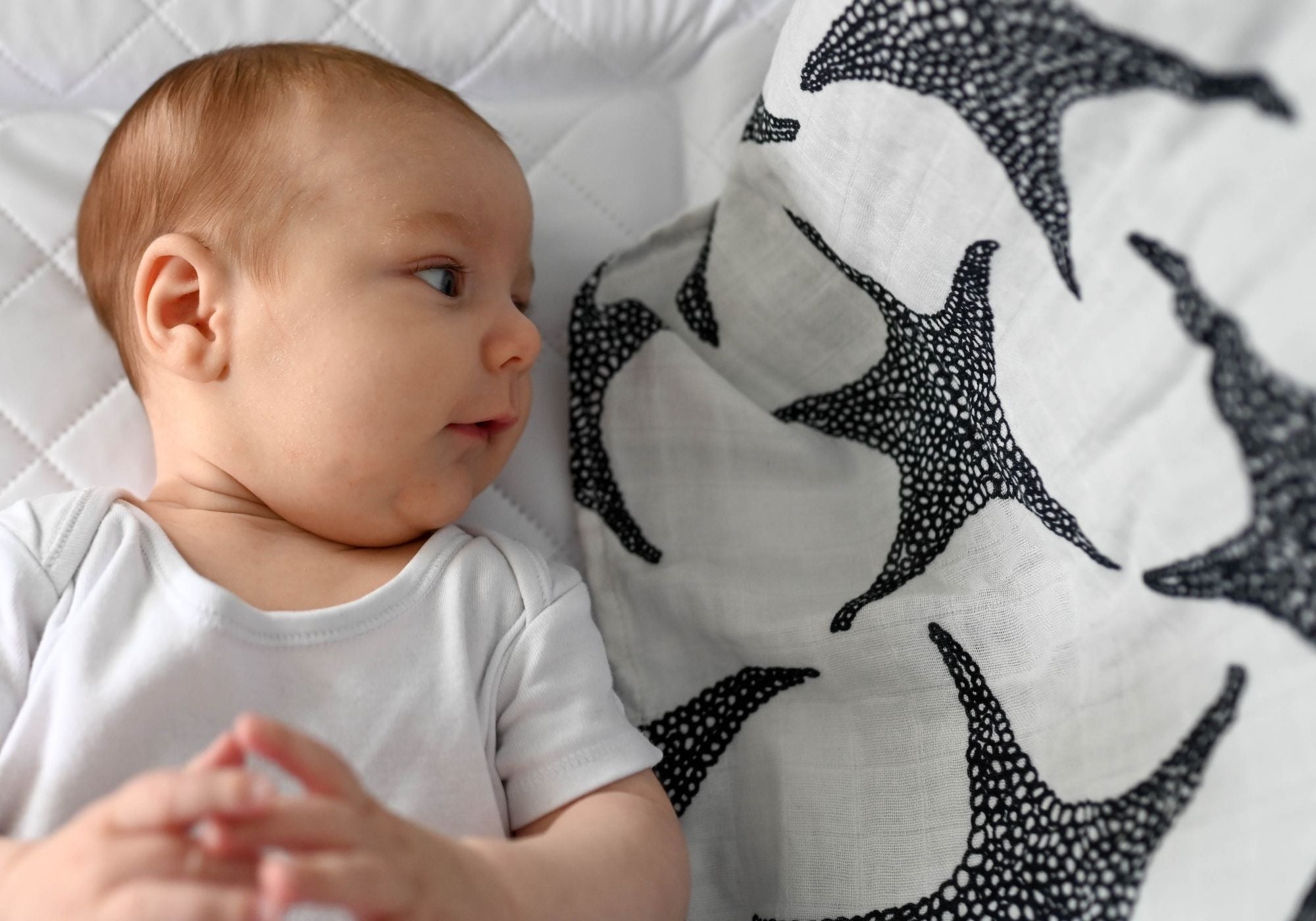 We design for both. Every pattern contains a range of scales matched to the age range it's for, so that patterns captivate and continue to captivate for months as vision sharpens. We also know which shapes babies prefer at each stage, so we design for what engages, not just what's visible.