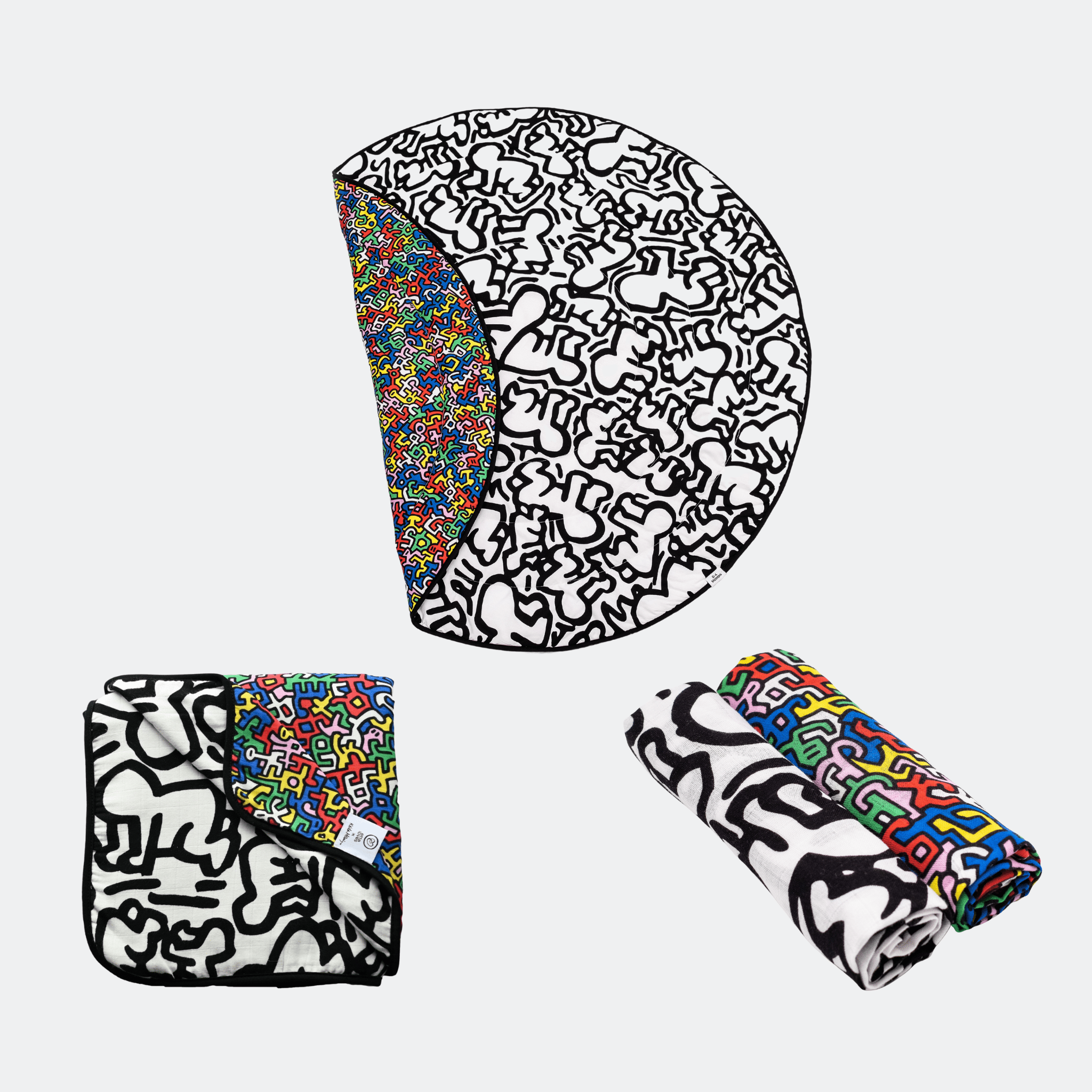 Bundle contains a playmat, blanket and muslin 2-pack in either Animal, Plant or Keith Haring prints.